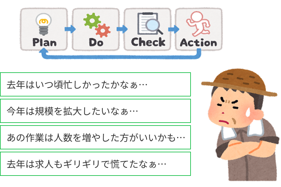 営農計画を確認し、いつ頃から人材を増やしたいのか時期を見立てて、求人サイトへの掲載準備は早めに着手しましょう。写真の準備や、募集要綱などの検討事項があります。